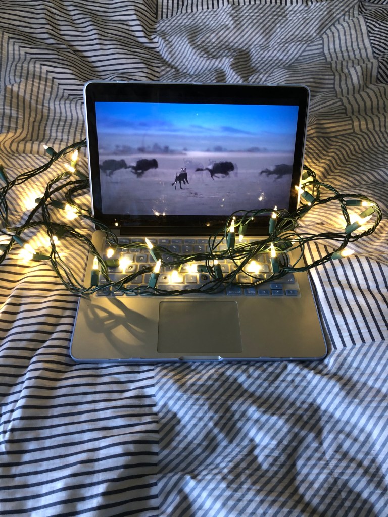 While in quarantine, going to the movies is not really an option, so many people have been staying home and watching Netflix in bed. In this bizarre time, this haiku made me think of sitting and watching a nature documentary right at the point where a predator catches the prey that the filmmakers have been following. It is a mixture of sad and happy, and overall an impressive display of the power of nature. I also wanted to incorporate light, as it is the focal point of the haiku. This cozy, home movie setup can still produce the types of emotions a film in a theater can produce.