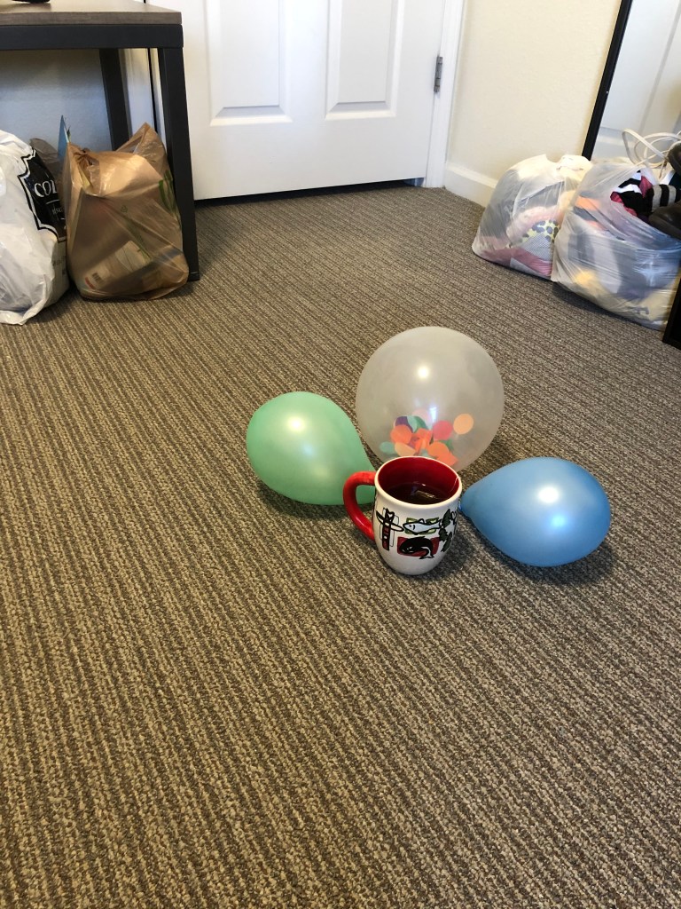 This haiku made me think of cleaning up the day after a birthday party. I did not choose to take the “coffee cup decal” detail literally, and instead saw it as a metaphor for capturing the moment even when it is a sad moment that requires a lot of motivation. The entire theme of this haiku seemed sad, like the aftermath of a birthday. There are deflated balloons and bags of trash to be discarded, the last remnants of the happy event that took place. There also is a literal cup of coffee to motivate the character supposedly cleaning up the mess.